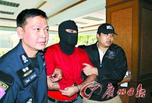 在曼谷的一所警察局外,警察押送遭逮捕的恐怖疑犯(中)