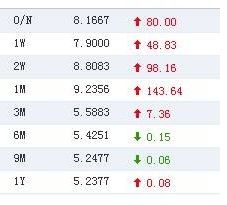 新华08网北京1月18日电(记者高立)中国外汇交易中心公布的数据显示,18日,上海银行间同业拆放利率(Shibor)继续显著上涨,隔夜品种继续向上,突破8%的高位。