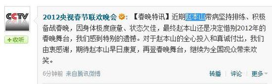 中国经济网北京1月19日讯 2012央视春晚官方微博今日发布消息称,赵本山因带病坚持排练,积极备战春晚,身体极度疲惫,状态欠佳,最终决定惜别2012年春晚舞台。全文如下: