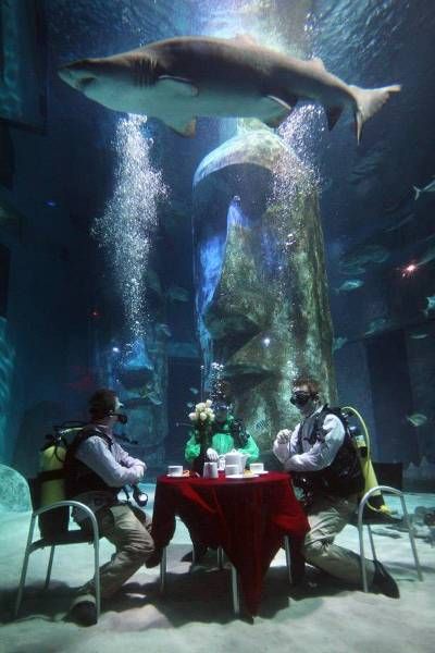 据报道,三名“勇敢”的潜水员进入一个装有鲨鱼的巨大水箱中,潜入箱底,围坐在一张布置好的桌子旁开起了“茶话会”,拿着杯子做喝茶状。不过由于戴着潜水设备,他们没有真的喝茶,主要是向游客展示。数条鲨鱼则在他们身旁近距离游动,并未对潜水员发动攻击。