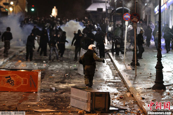 当地时间2月12日,希腊议会通过总额为33亿欧元的新紧缩措施。希腊警察和示威者在首都雅典的街头爆发了冲突。图为雅典宪法广场的冲突现场。