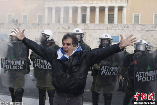 当地时间2月12日,希腊议会通过总额为33亿欧元的新紧缩措施。希腊警察和示威者在首都雅典的街头爆发了冲突。图为一名示威者在雅典宪法广场上大声呼喊。