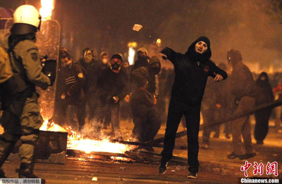 当地时间2月12日,希腊议会通过总额为33亿欧元的新紧缩措施。希腊警察和示威者在首都雅典的街头爆发了冲突。图为示威者向警察投掷石块。