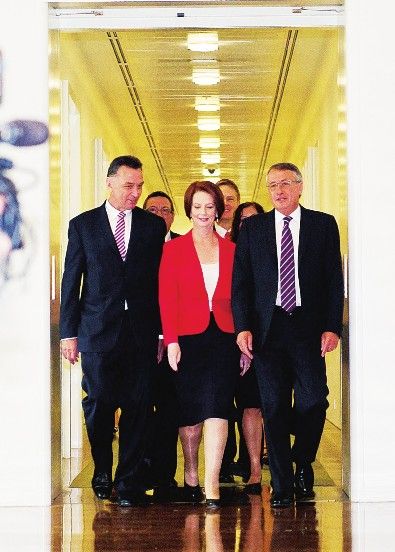 日前,澳大利亚总理吉拉德(中)在工党党内投票中以71票比31票击败前总理、前外长陆克文,连任工党党首。图为吉拉德从首都堪培拉的投票现场走出。