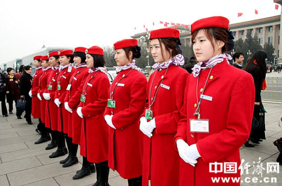 3月3日下午3时,全国政协十一届五次会议在北京人民大会堂隆重开幕。礼仪小姐靓丽的身影出现在广场。中国经济网记者 郝红波 摄