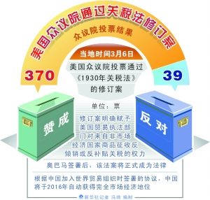 众议院当天以370票赞成、39票反对的结果通过了这一修订案。这一修订案明确赋予美国贸易执法部门对来自非市场经济国家商品征收反倾销或反补贴关税的权力。由于参议院已于5日投票通过该法案,目前该法案已递交给美国总统奥巴马。奥巴马签署后,该法案将正式成为法律。