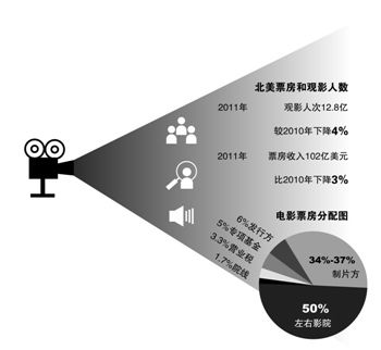 2011年,北美院线有12.8亿人次走进电影院进行观影,较2010年下降了4%,这是北美院线16年以来的最低数据。2011年美国电影票房收入102亿美元,比2010年下降3%。