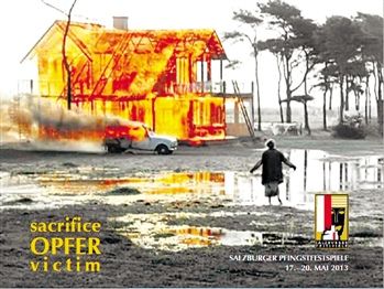 事实上,萨尔斯堡音乐节也并不是因为老态龙钟而谋求新血液,它曾一向以“反现代的现代产物”自许。这让人不难理解,为什么2013年萨尔斯堡音乐节选取了这样一张封面海报:在一个乡村道路旁,一位中年妇女光着双脚,趟过泥泞,迈向燃烧的楼房和汽车。
