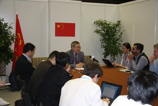 当天下午5:00,苏伟同志在中国代表团办公室接受了彭博新闻社、朝日新闻、印度时报等11家境外媒体集体采访,就媒体关注的资金支持、对个别发达国家态度的评价、中国碳排放峰值等问题进行了阐释。国内新华社、中央电视台、中新社等中方媒体也参与了采访。