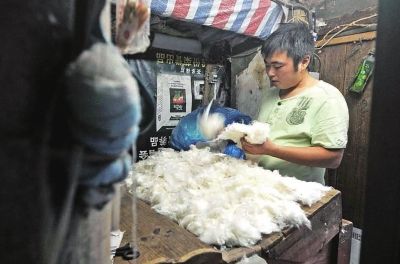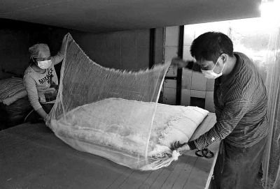 “现在我们主要接宾馆、旅店的活,旧棉被加工扣除成本,也没多少赚的。现在城里人买棉被,主要到大商店里去挑选,九孔被、丝绵被和羽绒被往往是首选,看着轻便,睡着也很舒服。”蔡师傅说。