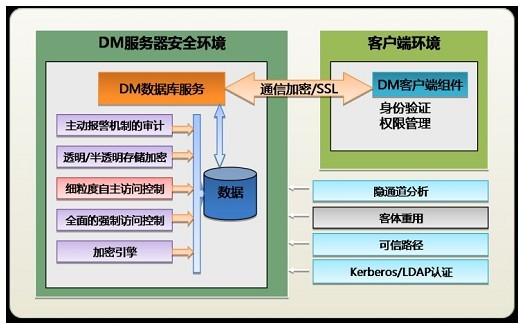 DM7不但是国内首个通过EAL4级安全认证的数据库产品,同时也是国内首个通过公安部信息安全产品检测中心安全四级检测的数据库产品。DM7不仅具备大规模事务处理能力和高性能大数据分析能力,还提供了存储加密、数据库文件保护、资源限制、通讯加密、访问控制、用户鉴别、安全审计、用户管理、系统管理和日志管理等各项安全功能。多种身份鉴别方式、自主访问控制、多权分立的安全机制、标记与强制访问控制、审计和实时侵害检测数据库加密、资源限制、客体重用等众多安全特性,结合完全自主知识产权,将DM7打造成一个能有效保证用户数据可靠性与安全性的有机整体。用户可以利用DM7强大的功能建立高性能、高安全、高可用的企业级数据管理与分析平台。同时,DM7的高安全性保证了数据库系统在复杂的支撑平台和网络环境中能简单、安全、有效和统一的管理用户数据。