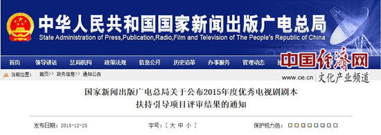 中国经济网北京12月28日讯 国家新闻出版广电总局网站消息,近日,广电总局最终确定了2015年优秀电视剧剧本扶持引导项目。据中国经济网文化产业频道记者了解,此次共有27个项目入选,其中《白鹿原》等5部作品入选重点扶持项目,《桃花盛开的地方》等22部作品入选一般扶持项目。