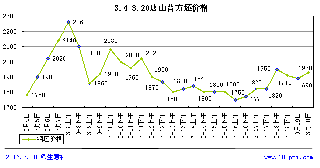 据生意社价格数据监测,唐山钢坯价格在3月14日至20日期间,整体累计仅上涨90元/吨,虽然价格依旧上窜下跳,但幅度较前一周明显收缩,且最大振幅在200元/吨,不及前一周的一半。生意社观点认为,上周出现这个行情,一方面是钢坯直发资源成交时好时坏,且下游轧材厂采购相对谨慎,询盘积极对比,导致钢厂厂家调价难以出现大幅波动;另一方面则由于下游成品材价格持续下跌,拖累钢坯市场,且世园会的利好预期基本消耗殆尽,终端成交受阻传导至贸易市场冷清行情。最终导致钢坯价格在1800-1900元/吨徘徊,既锁定了钢坯厂的利润,又保证了轧材厂的成本。另外,周末钢厂三旬调价出台,市场基本预期会保持稳中小涨态势,因此生意社钢铁分社何杭生预计本周钢坯价格还有回调空间,价格预期在1870-1950元/吨。
