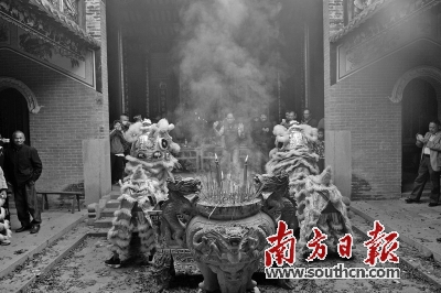 2月11日元宵佳节,毗邻广州帽峰山森林公园的谢家庄经济联社内热闹非凡。上午8时起,阵阵锣鼓和鞭炮声中,来自村社的20头醒狮陆续汇聚谢氏大宗祠前,入祠行拜、舞狮表演、采地青……节日氛围浓厚。
