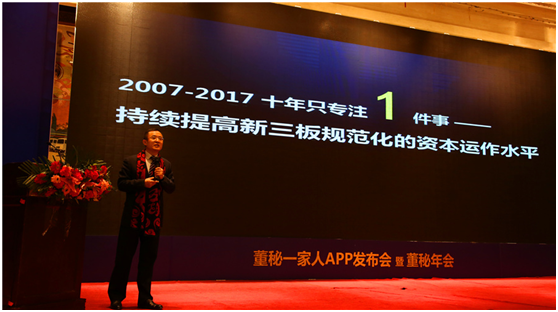 发布会上,董秘一家人创始人崔彦军分享了他10年来的心路历程。自2007年开始,崔彦军接触新三板以来的10年里只做了一件事,就是持续提高新三板规范化的资本运作水平。“董秘一家人”从线下宣讲的1.0时代逐步走向以微信朋友圈为主的2.0时代,经过了以“董秘一家人”公众号为代表的3.0时代,如今“董秘一家人APP”上线标志着4.0时代的来临。随着为新三板董秘服务能力提升,“董秘一家人APP”将致力于成为全球最大的董秘学习平台,为董事长、董秘、财务总监与高管提供全方位的服务。