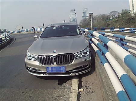 10日14点30分许,在南岸区海铜东路往长江大桥方向立交匝道上,发生了一起单车事故。南岸区交巡警支队摩托车大队接警后立即赶往现场,发现一辆宝马牌轿车车身左侧与护栏接触,受损严重。民警根据现场散落的碎片,判断该车应是刚进弯道时撞上护栏后,又滑行了数十米。据宝马轿车司机肖先生介绍,当时自己正准备往长江大桥方向行驶,因车速过快,在通过立交桥匝道时不小心撞上了左侧护栏,他下意识地紧急制动,可车辆仍靠着护栏又向下滑行了几十米,还好没有人受伤。据悉,该车维修费用估计在20万元左右。