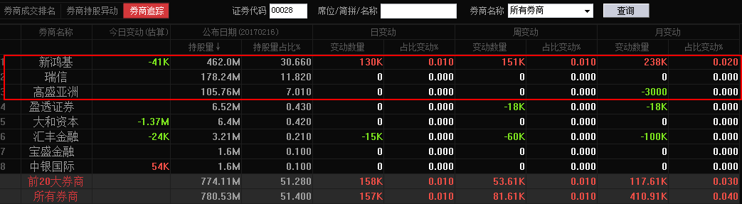 同时,根据交易宝数据,持股天安前三名的券商分别为新鸿基、瑞信、高盛亚洲,总共持股比例为47.5%。这三大券商在2月17日的增减持并不明显。