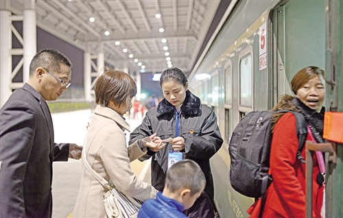 广铁集团怀化货运中心奉令抽调货运人员组成临时旅客列车包乘组,先后担当怀化至广州北/东莞临客K6566/7、K6568/5次和怀化至上海南临客K4590/4589次值乘。这些“跨界”组建的列车员编队牢记“平安春运、有序春运、温馨春运”目标,一丝不苟做好为旅客服务工作,得到广大旅客交口称赞。图为值乘的列车员在东莞火车站验票、引导旅客上车。 黄石松摄
