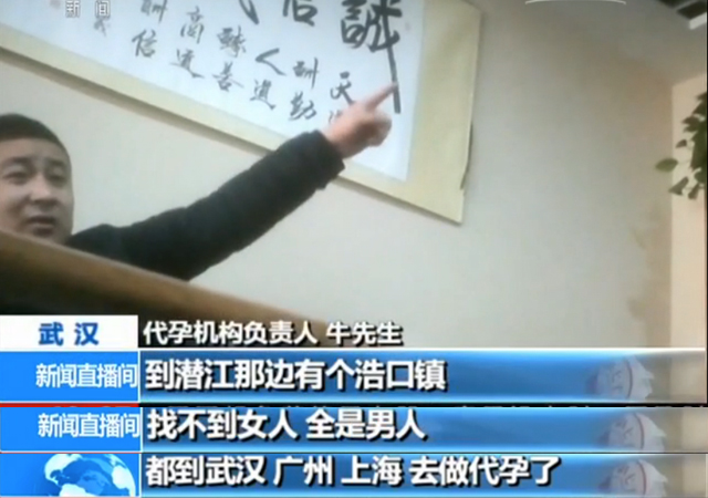 代孕机构负责人 牛先生:潜江那边有个浩口镇,到那个镇上,过段时间你去看,找不到女人,全是男人,都到武汉、广州,去做代孕了。