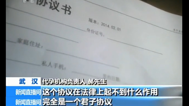 代孕机构负责人 郝先生:这个协议在法律上起不到什么作用,完全是一个“君子协定”。您过来做这件事情,第一肯定是要去多方面了解,信任吧,讲求一个诚信。就是说您这边是需求者,就是想得到一个健康的宝宝,是吧。包括代孕妈妈她做这件事情,也是想顺顺利利把小孩生出来,她拿这部分佣金,咱们都希望这事情有一个好的结果。