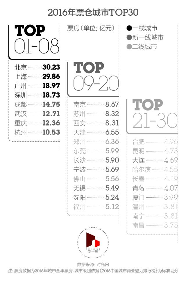研究了电影路演城市选择的前因后果之后,新一酱也想尝试通过数据分析能不能发掘更多潜在的票仓城市和路演目的地城市。因此我们选取了2016年票房超过1亿元,且当地平均票价超过30元的城市。