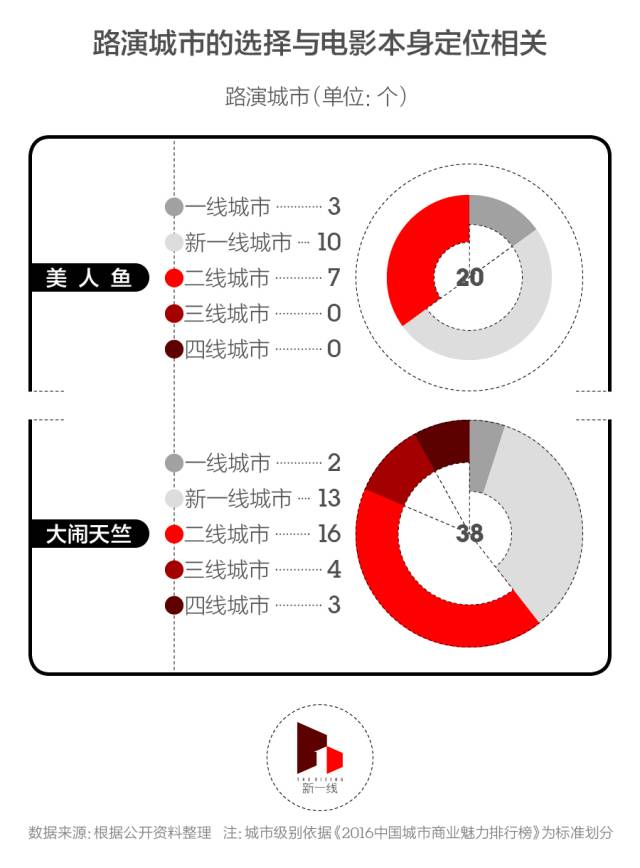 最终总票房超过30亿元的《美人鱼》在宣传时,由星爷带队跑了20个城市,其中13个为一线城市和新一线城市,是很明显的“主攻一线和新一线城市”策略。