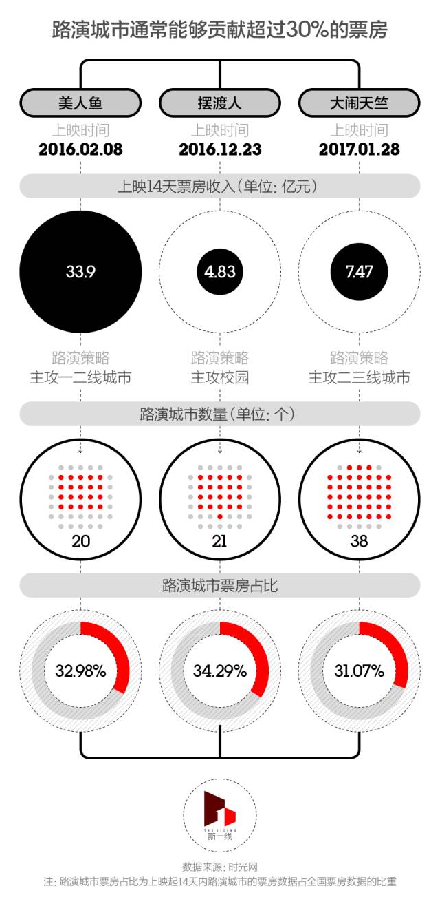 仔细研究电影路演城市的选择,新一酱找到了一些差异。去年的春节档电影《美人鱼》,圣诞节前上映的《摆渡人》,以及今年春节档的《大闹天竺》这三部电影,从路演策略上来看可能可以算作三种典型。