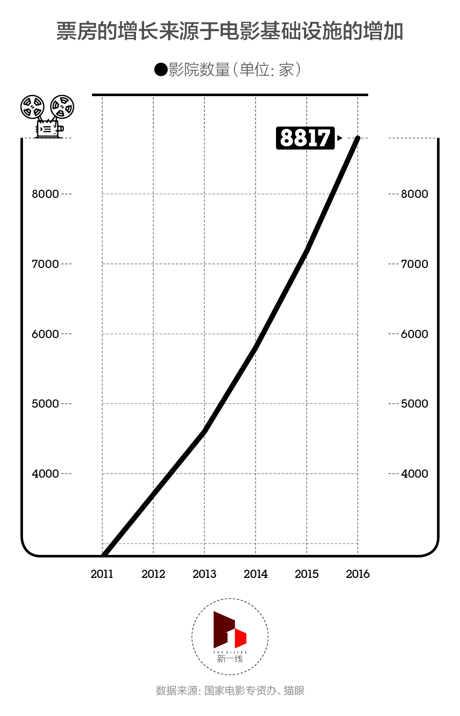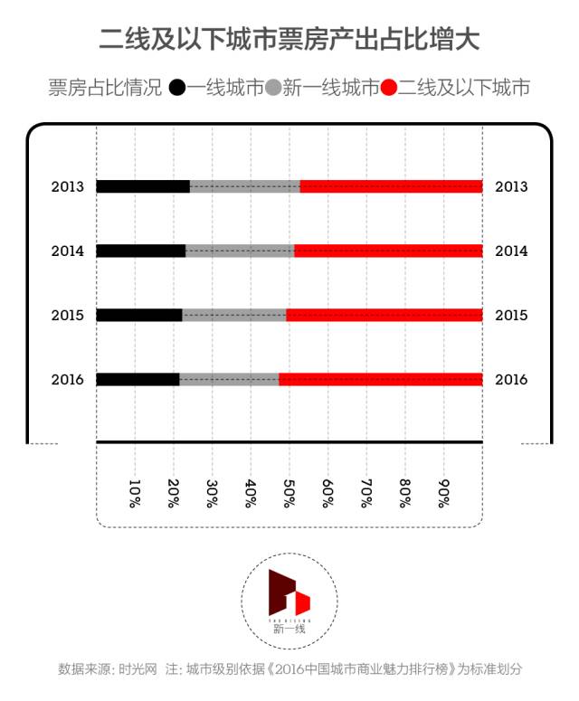 在城市电影消费升级需求和国家出台的电影产业支持政策的双重刺激下,资本涌入了电影市场,影院数量迅速增长。新一酱比较了影院、银幕、票房数据,发现在全国范围内,票房与电影基础设施数量的增长不仅呈正相关,而且几乎拥有完全吻合的斜率——值得指出的是,2015年票房增长超越了电影基础设施的增长率,但在2016年这种不平衡又被“找了回来”。