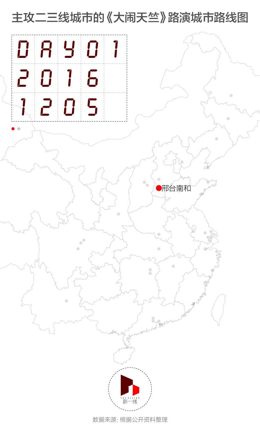 下图的今年春节档的《大闹天竺》在宣传期内去到的38个城市的路线图,其中被重点标出的10个城市主创团队去了两次。