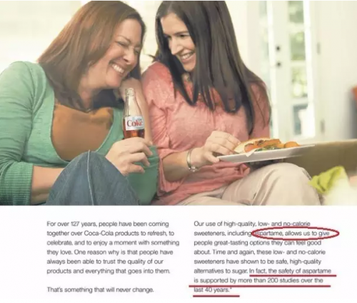 2013年,可口可乐在USA Today上刊登的为阿斯巴甜辩护的广告称,在过去40年里,阿斯巴甜的安全性被200多项研究支持。由此再次引发争议。