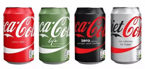 可口可乐旗下的四款产品:原味可口可乐、可口可乐Life(Coca-cola Life)、零度可乐(Coca-cola Zero Sugar)和健怡可乐(Diet Coke)
