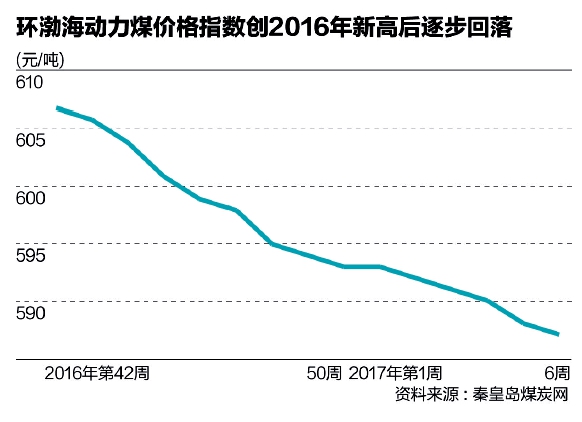中宇资讯煤炭分析师关大利对第一财经记者表示,由于节后没有执行“276个工作日”、冬季气温偏暖等原因,民用需求提振有限,工业需求增速也不明显,近期煤炭供应略显宽松。预计2017年煤炭市场价格高位不及2016年,低位要高于2016年,低位即整体波动水平较小。
