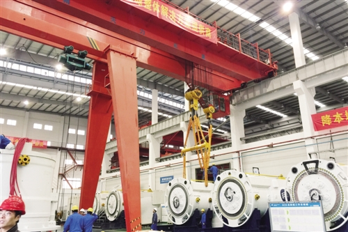 广东佛山明阳风电总装车间,工人们在装配风力发电机组。在银行债委会的帮助下,该公司加紧去产能,化解资金风险,研发出具有自主知识产权的1.5MW风机系列,实现“两高一低”的目标(即高发电量、高利用率、低度电成本)。经济日报记者 曹力水摄