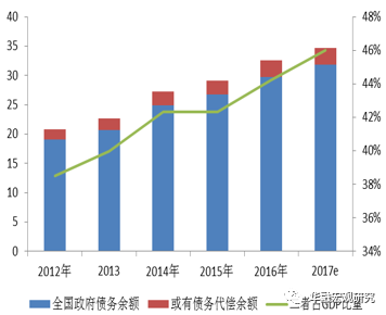 如果2017年为实现GDP增速6.5%,中央政府直接债务余额将约13万亿,地方政府直接债务余额约为20.8万亿,二者合计33.8万亿元。或有负债仍沿用0.46的比例约为15.55万亿元,按代偿率20%估算,可得出全国政府负债率为46%。可见政府负债率仍将不断上升,加杠杆步伐不减。