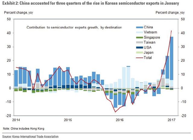 高盛认为,鉴于芯片需求强劲,而库存水平依然较低,预计2017年韩国芯片出口价格将平均上涨13%,二季度为价格高点。今年全年芯片出口总值将再涨25%,较此前预期的3%大幅上调。