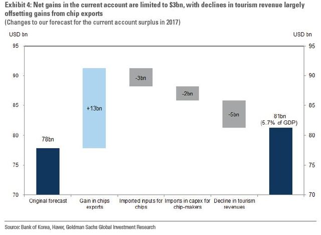 高盛认为,受中国厂商需求的推动,韩国芯片出口表现比预期的还要强劲。但是,因为地缘政治问题影响,中国游客对韩国旅游业的贡献将大幅下滑,最终导致韩国外贸在总体上遭到负面冲击。