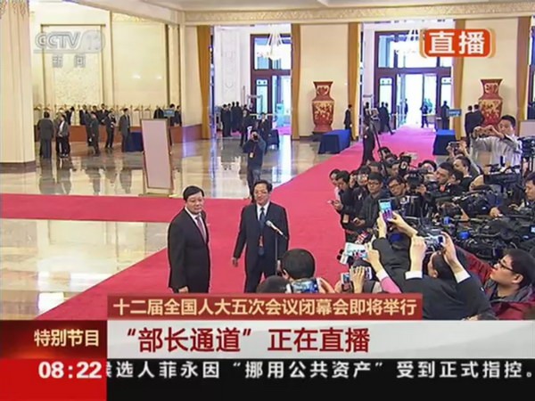 3月15日,十二届全国人大五次会议在人民大会堂举行闭幕会。会前,大会堂北大厅“部长通道”再次开启,这也是今年全国两会期间最后一次开启“部长通道”。这一次,又有六个部门的领导在这里回答记者的提问。