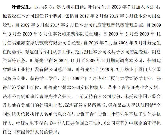 2003年7月,叶舒进入福耀玻璃工作。简历显示,2003年至2008年叶舒在配套、筹建等部门工作;2009年至2017年2月陆续担任采购部副总经理、供应管理部总监等。2017年2月,叶舒升任副总经理。一个月后的3月26日,他成了福耀玻璃新任总经理。
