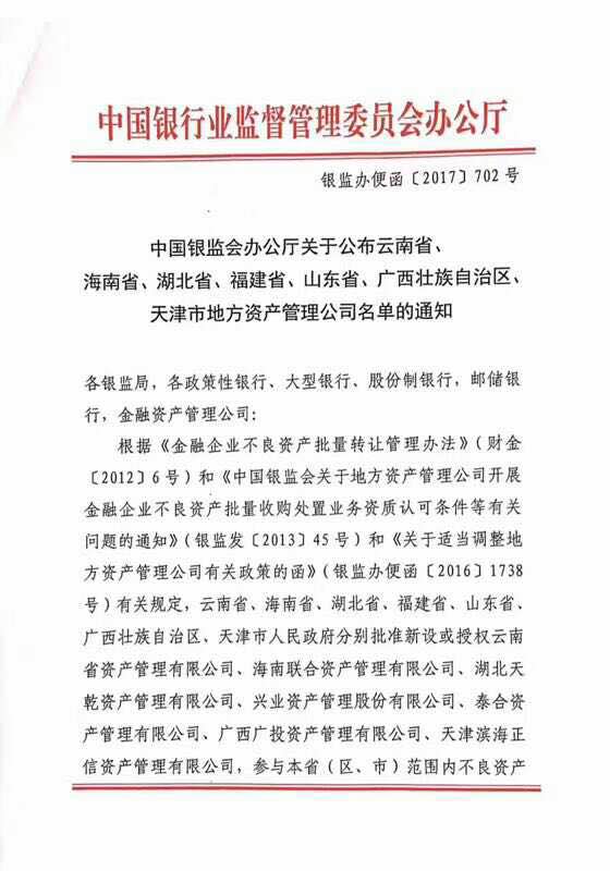 《通知》指出,根据财金【2012】6号,银监发【2013】45号以及《关于适当调整地方资产管理公司有关政策的函》【2016】1738号(下称“1738号文”)有关规定,云南省、海南省、湖北省、福建省、山东省、广西壮族自治区、天津市人民政府分别批准新设或授权云南省资产管理有限公司、海南联合资产管理有限公司、湖北天乾资产管理有限公司、兴业资产管理有限公司、秦合资产管理有限公司、关系广投资产管理有限公司、天津滨海正信资产管理有限公司共计7家参与本省(区、市)范围内不良资产转让工作。