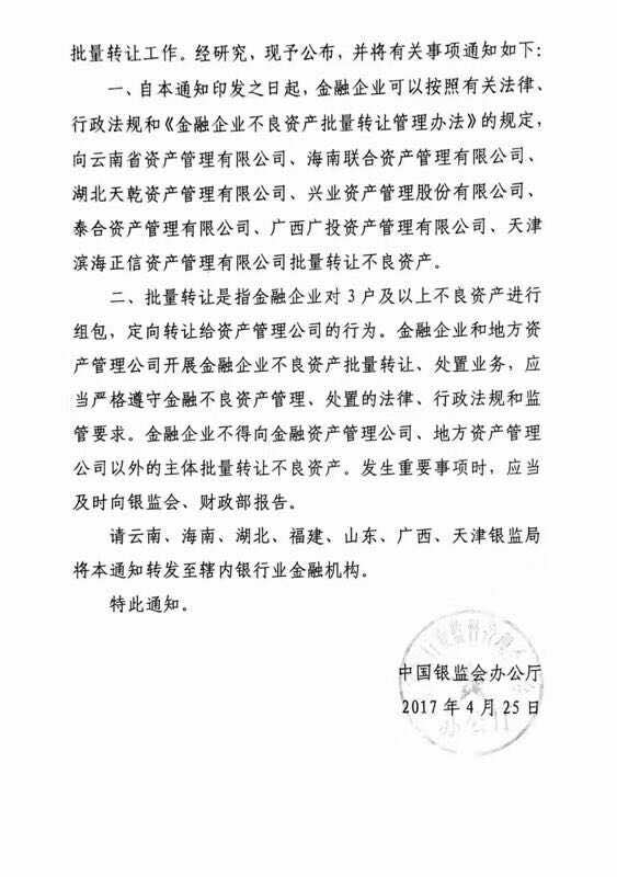 记者拿到的这份文件显示,4月25日,银监会办公厅下发《关于公布云南省、湖南省、湖北省、福建省、山东省、广西壮族自治区、天津市地方资产管理公司名单的通知》(下称《通知》,文件后附),共计7家地方AMC获准参与金融机构的不良资产批量转让工作。