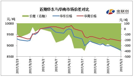 导语:五一归来,国内主流华东及华南市场价差明显拉宽,截止5月2日收盘,华东与华南市场价差达到400元/吨左右,而截至稿前,两地价差仍然较大。
