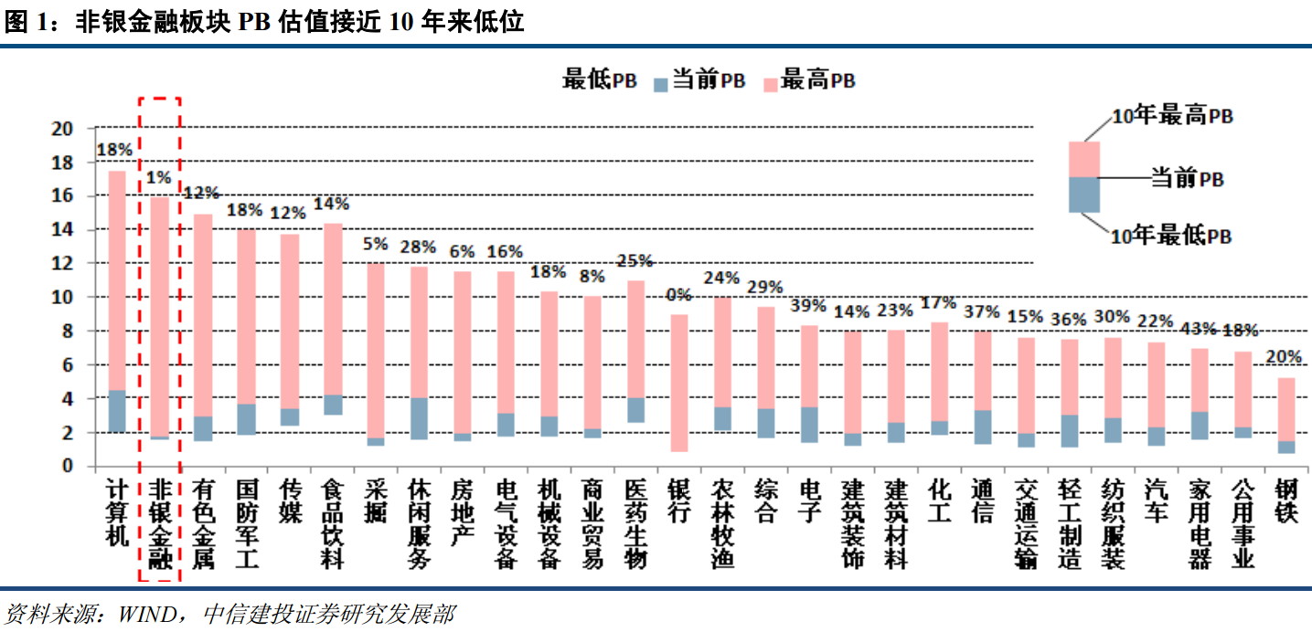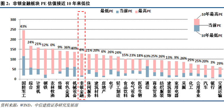 作为高 beta 的非银金融板块,强监管预期导致悲观情绪弥漫,板块估值水平持续下滑, 截至目前已降至 1.78倍PB 和 17.77倍的PE,距离 1.59倍PB 和 11.16倍PE 的 10 年最低水平仅有一步之遥。