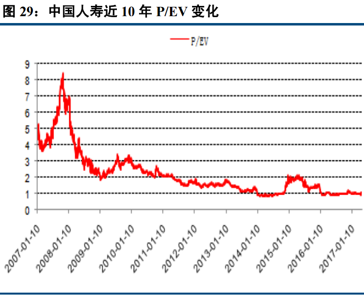 上市险企目前处于价值洼地,P/EV 均低于或者接近 1,对比近 10 年的历史 P/EV。