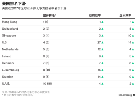1日据彭博报道,美国在世界竞争力排名中下滑一位至第四,落后于中国香港、新加坡和瑞士,原因是唐纳德·特朗普当选之后,这个全球最大经济体的企业高管对美国的信心下滑。美国上次摘得桂冠是2015年。