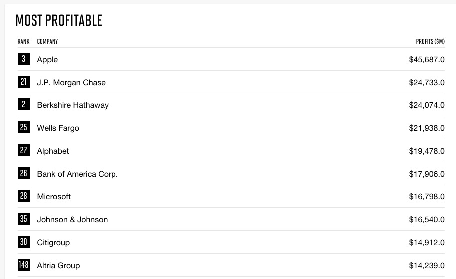 从盈利能力来看,前三位席次未发生变化。除苹果外,摩根大通排第二位,利润为247.33亿美元;伯克希尔哈撒韦位列第三,利润为240.74亿美元。榜上最赚钱的10大公司中除了一家生物制药和一家烟草公司之外,其余均为科技和金融企业。