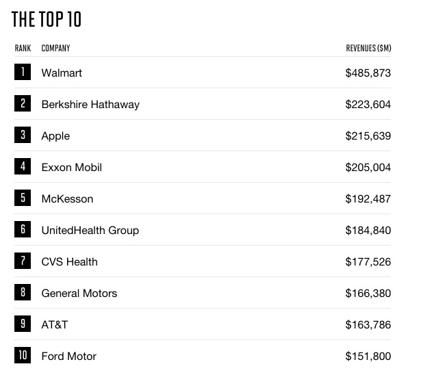 在今年的榜单上,沃尔玛连续第五年蝉联榜首,沃伦·巴菲特的伯克希尔哈撒韦公司紧追其后,位列榜眼。排名第三的苹果公司则继续保持利润榜的第一,成为最赚钱的美国500强公司。