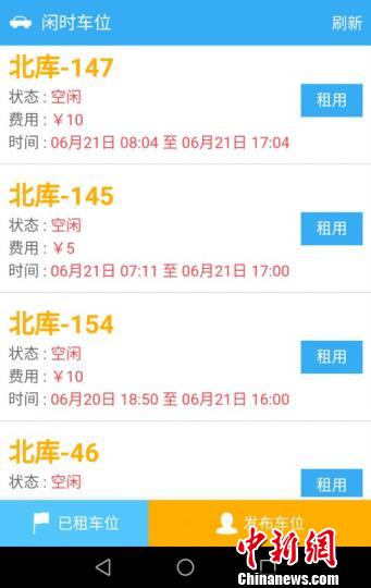 打开共享车位平台,“闲时流转,利己利人”几个字映入眼帘。整个平台分为“已租车位”和“发布车位”两部分。平台上,各闲时车位的编号、空闲时间和租赁费用一应俱全,方便有车位需求的业主根据时段选择适合自己的车位。