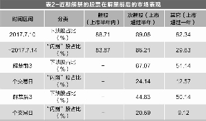 据Wind数据统计,今年第三季度的解禁规模总计有7236亿元(以6月30日股价估算),其中7月份有2163亿元,环比上升46%。一般来说,上市公司限售股解禁时,部分投资者对这一类股票以看空为主,可能会大量卖出。文中对2017年5月2日至2017年7月14日的解禁股进行了分类分析,其中“闪崩”定义为跌幅超过5%(表2)。从表2可看出,个股解禁前市场表现更敏感。