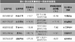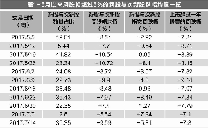自2017年3月27日次新股指数创出阶段性高点后,板块指数便一路下滑,炒作明显降温。统计5月份以来的“闪崩”股发现(为方便分析,以周跌幅超过5%的股票为研究对象,表1),每周次新股“闪崩”股数量占总“闪崩”股的比例都超过20%,占所有次新股总数的80%以上。与上市时间超过一年的股票对比,次新股跌幅均值也大多比前者要高。