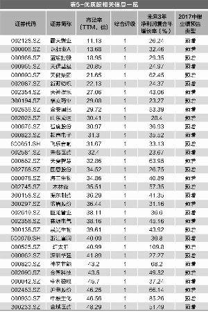 从长期来看,只有追求“价值投资”才能真正把握住好股票。据此,笔者根据未来三年净利润复合增长率大于20%,且市盈率小于50倍,机构综合评级为1(评级1为建议买入),且2017年中报业绩预告为预增的四个条件筛选出来32家企业(表5)。